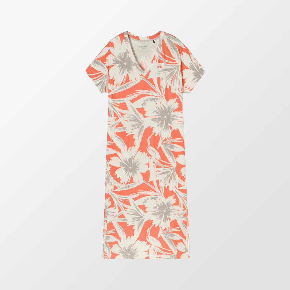 SLAAPKLEED PERZIK van Schiesser met een mooi bloemmotief, maakt deel uit van de SCHIESSER-serie "selected! premium" en combineert stijl met comfort. Met een V-hals en bijgesneden mouwen krijg je een modieuze look, terwijl de handige zakken en lange zijsplitten zorgen voor meer bewegingsvrijheid en praktische functies.