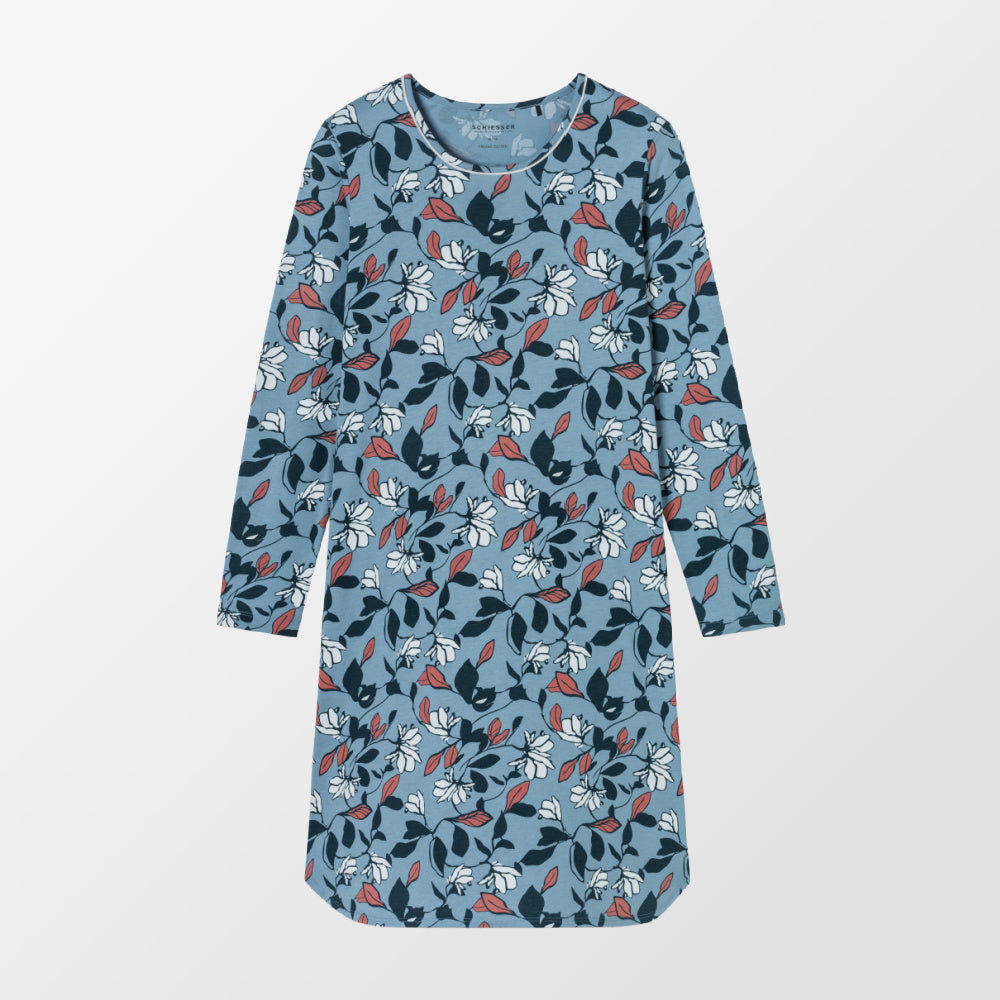 BEDSTRAND FLOWERS from Schiesser has a cheerful floral pattern in beautiful colors such as blue, white and red. The design with a rounded hem and small slits not only offers an elegant look, but also provides plenty of freedom of movement, making it ideal for a comfortable night's sleep or relaxing moments at home. The high-quality materials from Schiesser make you feel comfortable all night long. A perfect item for everyone who values both style and functionality!