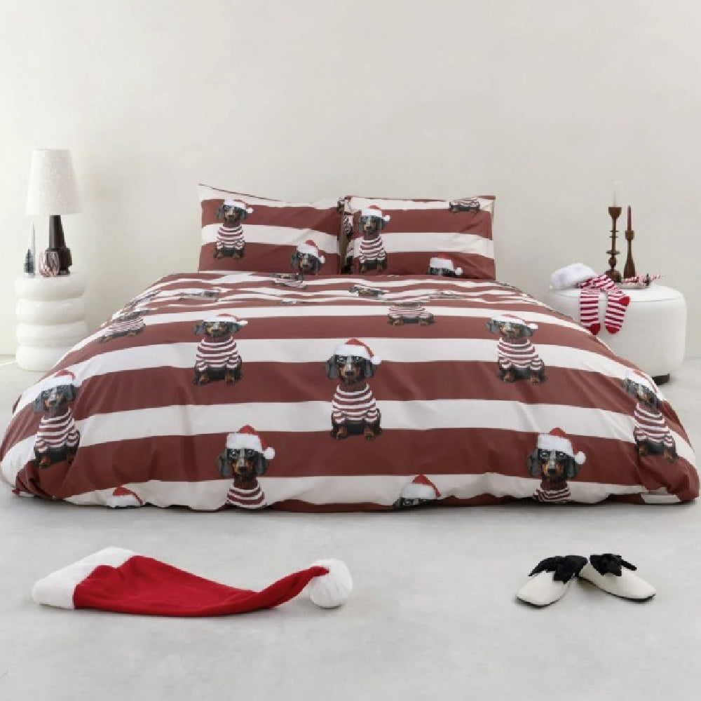 Het DEKBEDOVERTREK PIERRE XMAS van Snurk is een eerbetoon aan de ware kerstliefhebber, die al in november de lichtjes aanzet, de kerstplaylist uit het hoofd kent en zich verheugt op elk stralend moment van de feestdagen. Pierre, het schattige teckeltje van SNURK, wandelt over het hele dekbed in volle kerststijl: gekleed in een rood-witte trui en een feestelijke kerstmuts, vrolijk verspreid over klassieke rood met roomwitte strepen. De afbeelding straalt warmte, humor en traditie uit, met precies de juiste hoeveelheid eigenzinnigheid die SNURK zo bekend maakt.