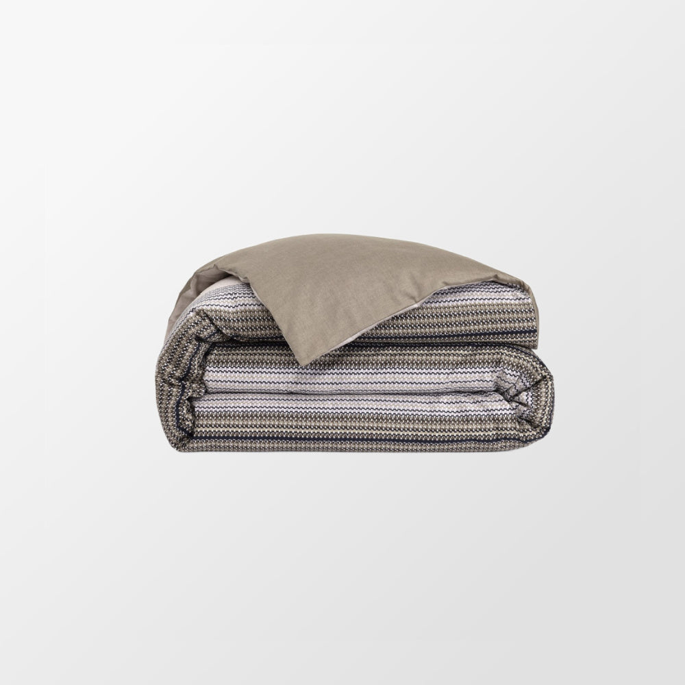 DEKBEDOVERTREK MODERNIST van Hugo Boss eert de modernistische beweging uit het begin van de twintigste eeuw, geïnspireerd door een eigentijds en elegant ontwerp voor de slaapkamer. De schoonheid van deze stijlbeweging, die wordt gekenmerkt door strakke lijnen, herhaling en een nadruk op de essentie, komt tot uiting in een grafisch lijnenspel dat een gevoel van rust en ritme oproept. Het geometrische ontwerp bestaat uit herhalende lijnen in zachte minerale kleuren, subtiel afgewisseld met antracietkleurige accenten die de diepte en structuur van het geheel benadrukken. De achterkant van het dekbedovertrek biedt een elegant contrast met een effen kakikleur, wat een elegant textuureffect creëert, een subtiel, maar doordacht detail dat de veelzijdigheid van het ontwerp onderstreept.