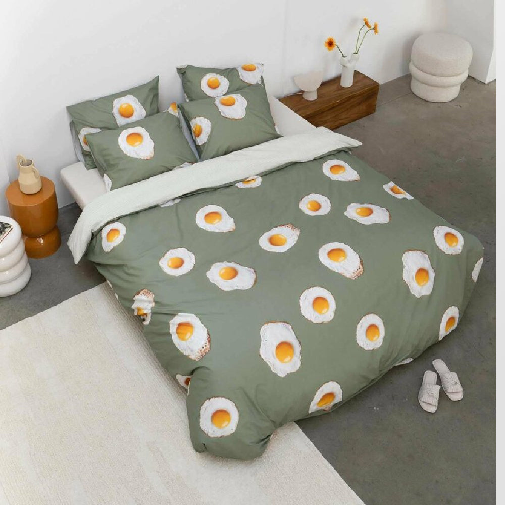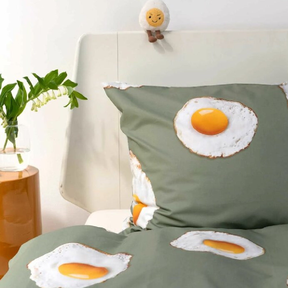 Het DEKBEDOVERTREK EGGS van SNURK is een speelse ode aan de kunst van het uitslapen, en aan een goed gebakken eitje. Over een zachte, saliegroene achtergrond zijn ze groot en aantrekkelijk verspreid: zonnige, perfect gebakken eieren, gepresenteerd alsof ze net uit de pan komen, maar dan om onder te kruipen in plaats van op te eten. Deze opvallende print is in staat om een gevoel van humor te verenigen met een verrassende en kalmerende uitstraling.
