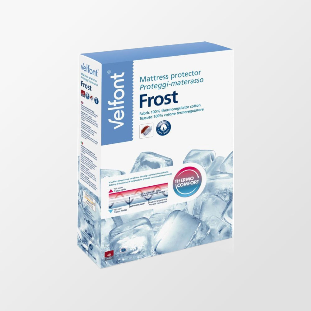 De MATRASBESCHERMER FROST van Velfont biedt de ideale oplossing voor iedereen die 's nachts te maken heeft met warmtewisselingen, overmatig zweten of een onrustige slaap door verstoringen in de temperatuur. Deze vernieuwende matrasbeschermer verenigt comfort, technologie en functionaliteit in één product, dat is ontwikkeld om jouw slaapervaring aanzienlijk te optimaliseren. Wat deze beschermer uniek maakt, is de inzet van de geavanceerde Outlast®-technologie, een materiaal dat aanvankelijk door NASA is ontworpen om astronauten te beschermen tegen extreme temperatuurschommelingen in de ruimte.