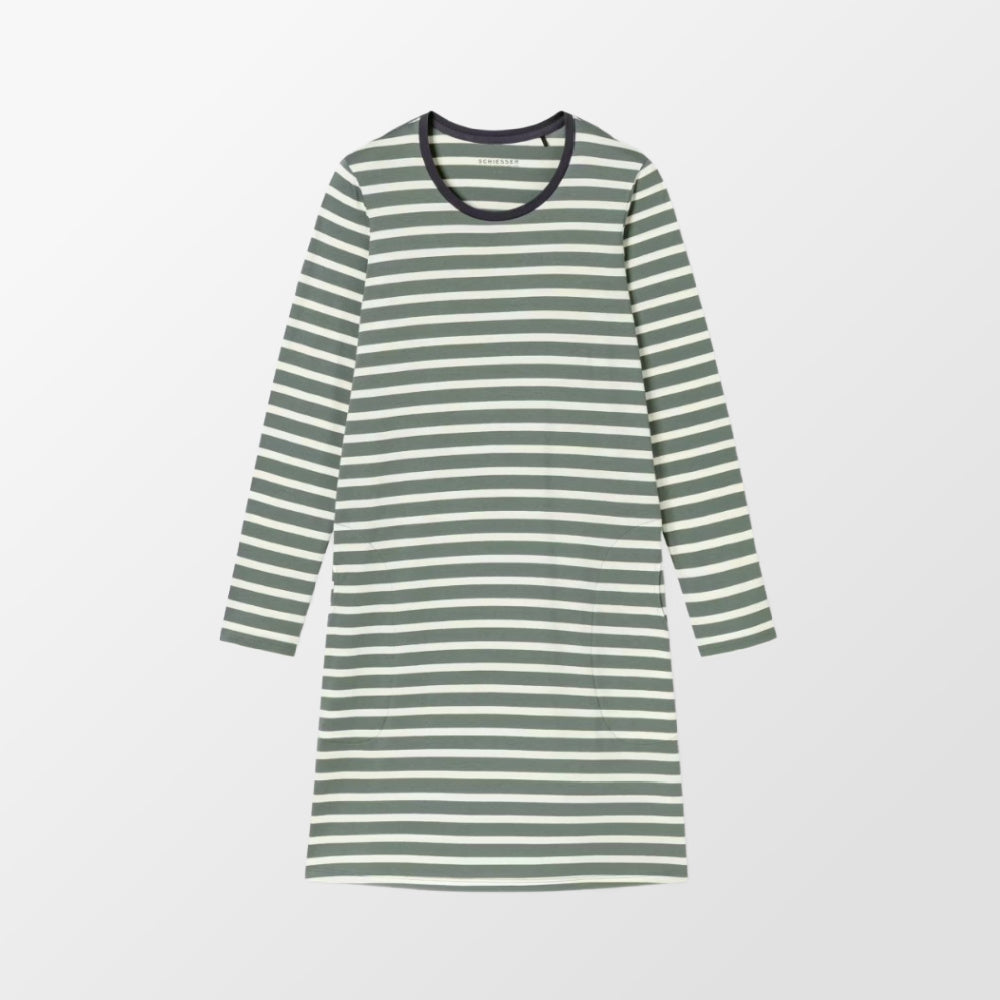Stijlvol SLAAPKLEED MINERAAL STREPEN van Schiesser, afkomstig uit de Casual Essentials-collectie, is een ware aanrader voor degenen die eenvoud waarderen en zachtheid en vrijheid van beweging tijdens het slapen. Het model heeft een comfortabele pasvorm met lange mouwen en is vervaardigd uit een zachte single jersey van uitstekende kwaliteit. De groene en witte accenten creëren een frisse en tijdloze uitstraling, terwijl de afgeronde zoom en subtiele steekzakken aan de zijkant, extra draagcomfort en praktische functies bieden. Het slaapshirt, dat een totale lengte van 95 cm heeft, valt stijlvol op de knie, perfect voor ontspannen avonden of lange ochtenden in alle rust. Door het ademende katoen heeft de stof een aangename zachte textuur op de huid, een ideale mix van elegantie en comfort voor elke nacht.
