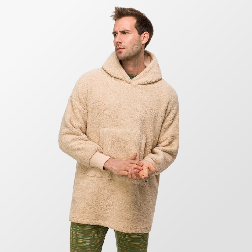 De lange mouwen passen perfect aan de polsen door een brede rekzoom, waardoor de warmte goed binnen blijft en het comfort optimaal is. Aan de voorkant staat een ruime kangoeroezak die niet alleen je handen warm houdt, maar ook als praktisch opbergvak voor je smartphone, afstandsbediening of iets lekkers fungeert. Elk detail is ontworpen om jouw cocoonmoment nog aangenamer te maken, zonder in te boeten op stijl of speelsheid.