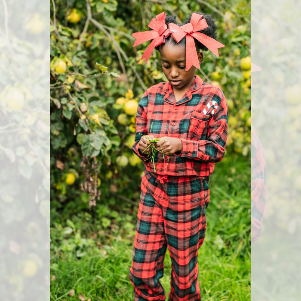 Het ontwerp combineert traditioneel met speels: de Schotse ruit in diepe rood- en groentinten roept de sfeer op van de feestperiode, terwijl het borstzakje en de achterkant zijn verfraaid met een vrolijke, karaktervolle print, een typisch Woody-detail dat zorgt voor een glimlach. De doorknoopsluiting maakt de pyjama niet alleen praktisch, maar geeft ook een klassieke, tijdloze uitstraling.