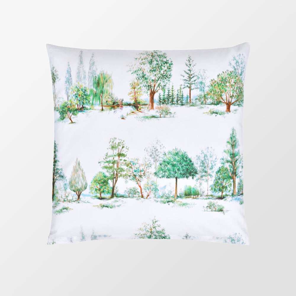 Het DEKBEDOVERTREK TREES van Christian Fischbacher geeft de rustige kracht en schoonheid van de natuur weer. Elke boom die je op het dessin ziet, is met de hand getekend in de studio van Christian Fischbacher. Met zachte potloodlijnen en verfijnde arceringen krijgt elke tak, bladnerf en boomkroon zijn eigen karakter. Wanneer al die illustraties samenkomen, vormen ze een ritmisch patroon dat rust uitstraalt en toch vol leven zit, alsof je uitkijkt over een stille, groene laan.