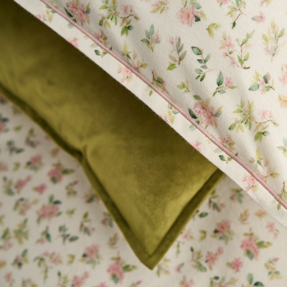 The DUVET COVER VIVIANE ORCHID from Nomo Exudes softness, style, and refinement. This design creates a calm, romantic atmosphere in your bedroom with a delicate floral print in soft roses and a subtle green background. Every detail has been carefully crafted, from the fine pattern to the subtle bourdon stitch finish, which creates an elegant relief and gives the whole a refined, finished look.