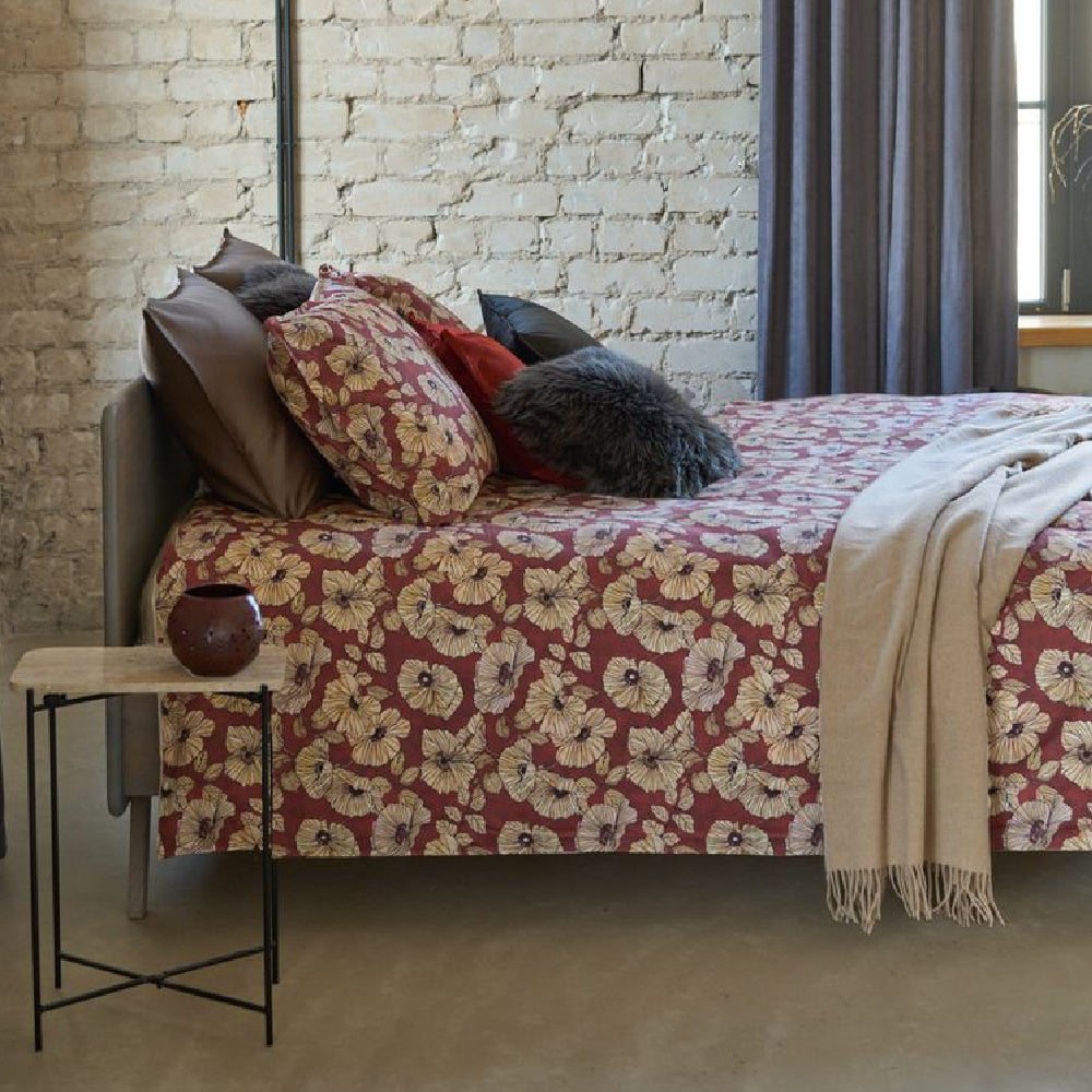 Le motif, riche et sensuel, n'est pas pour autant envahissant. Les fleurs semblent presque bouger sur le tissu, créant une dynamique à la fois apaisante et élégante. Il crée une atmosphère de confort et de douceur dans la chambre, tandis que les teintes plus profondes créent une ambiance chaleureuse, presque mystérieuse, idéale pour ceux qui apprécient un intérieur plein de caractère et de profondeur.
