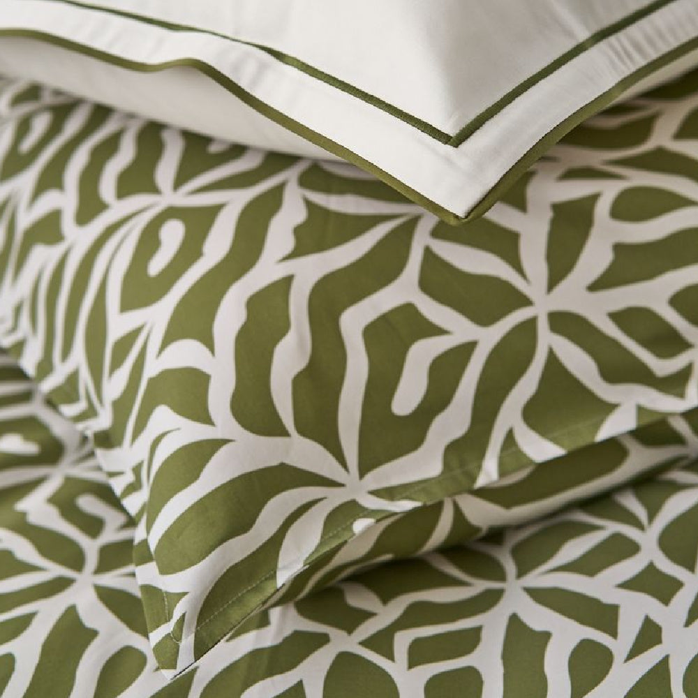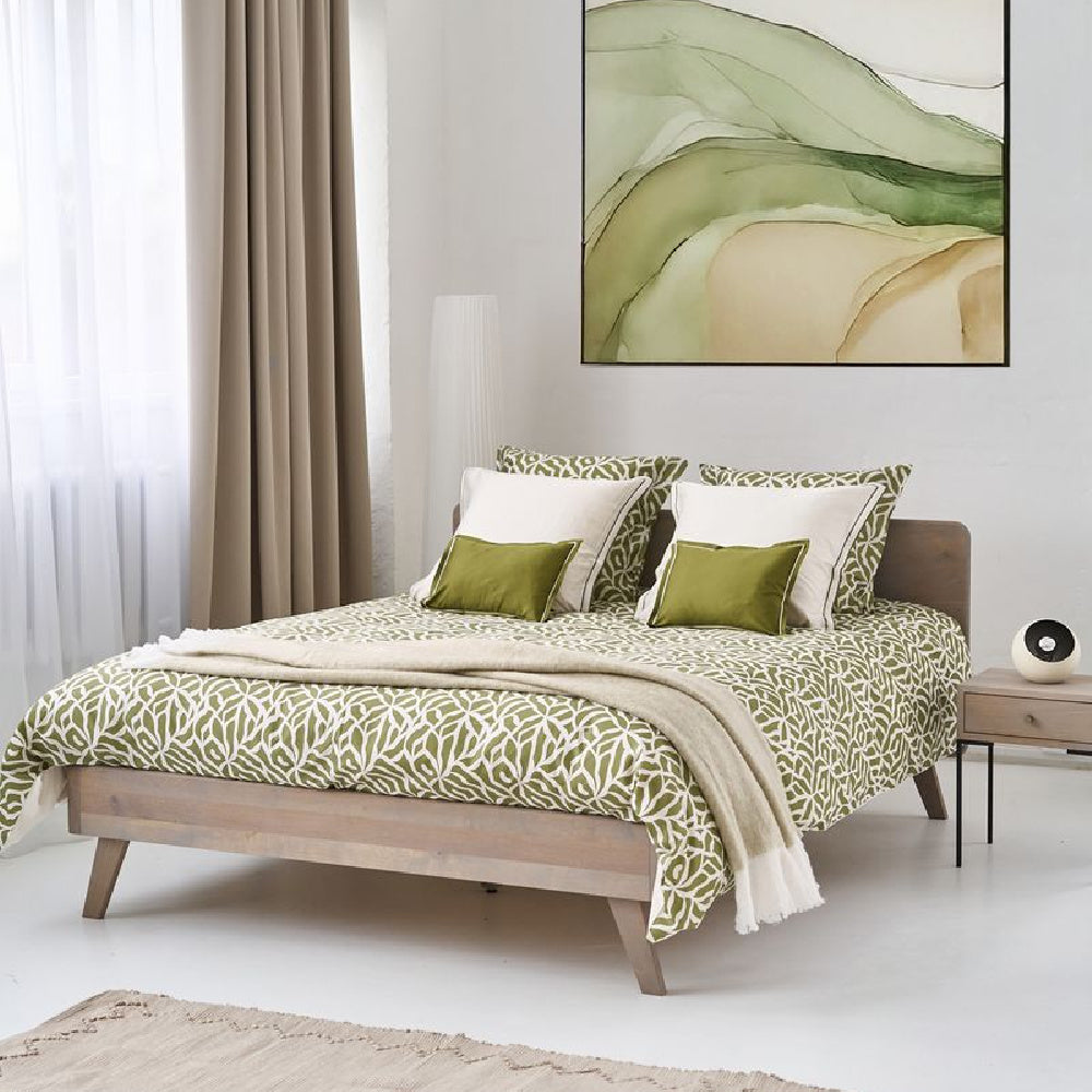 HOUSSE DE COUETTE BIANCA PESTO de Nomo allie lignes épurées et charme naturel, dégageant une fraîcheur apaisante qui s'intègre parfaitement à un intérieur contemporain. Son motif géométrique , subtil et sophistiqué , joue avec la lumière et le rythme, et son élégante association de couleurs, vert pesto tendance et doux accents babeurre, lui confère une allure vibrante et apaisante.