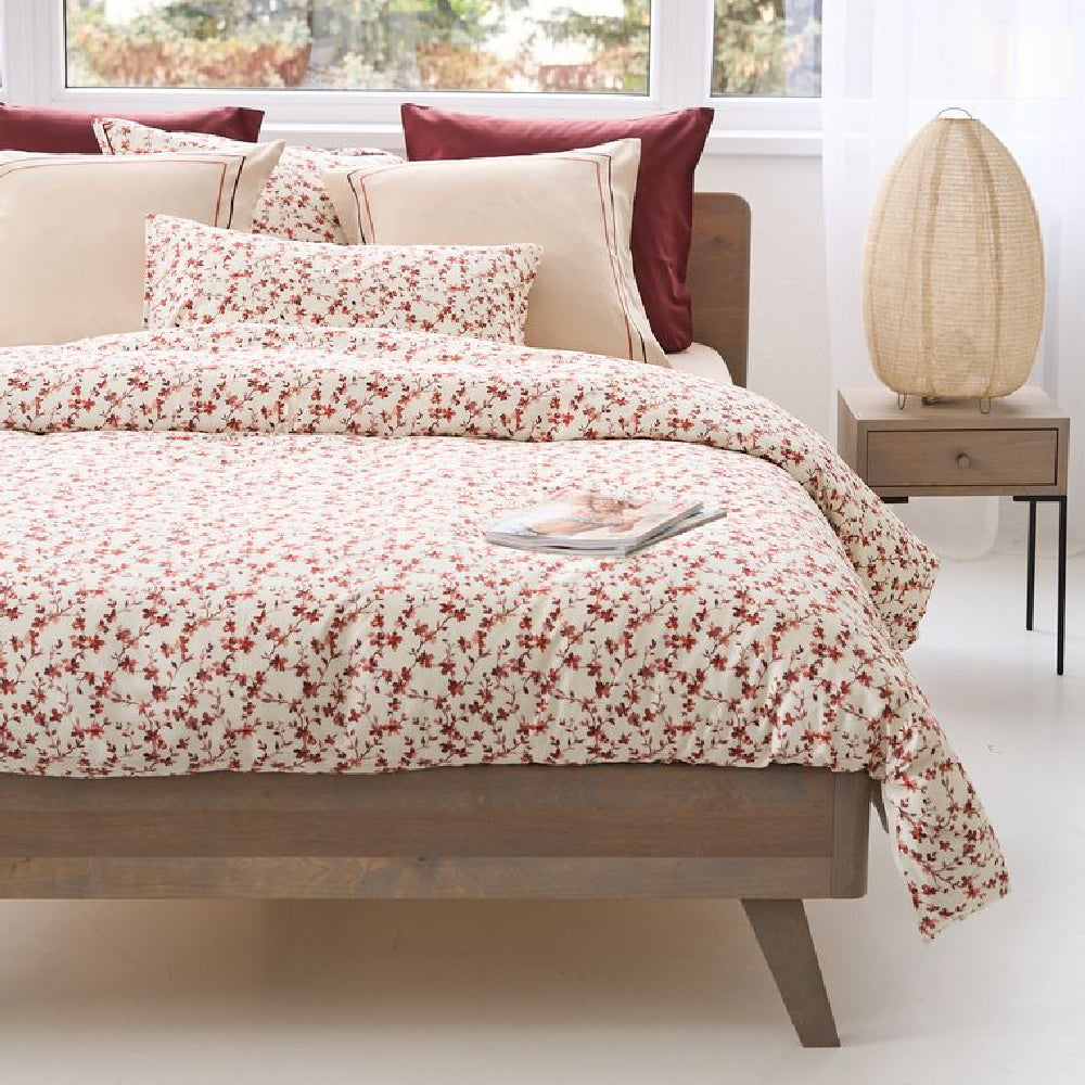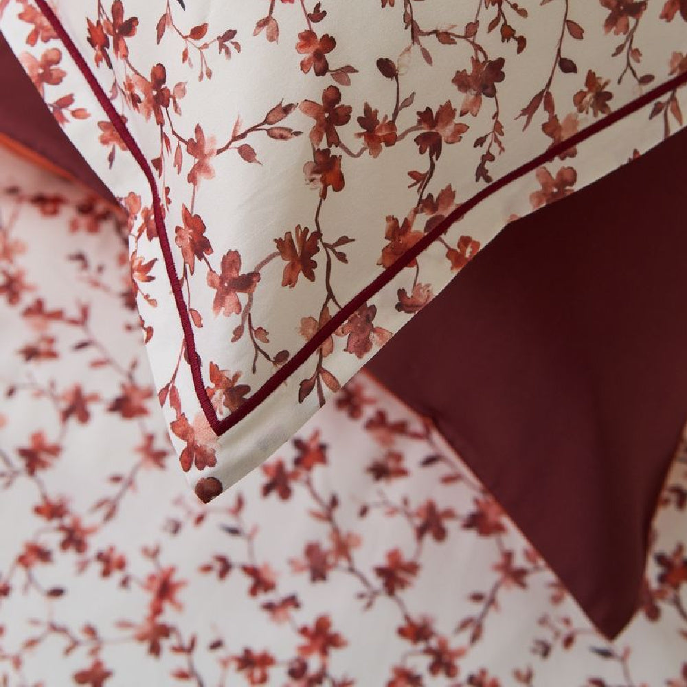 HOUSSE DE COUETTE BRITT PORTO de Nomo allie style et charme. Le nom Britt évoque la force et le raffinement, des caractéristiques qui se marient dans ce design sophistiqué. Un délicat imprimé floral, appliqué avec délicatesse, orne le devant de la housse. Ce motif, aux tons chauds de porto, de babeurre et d'une touche de rouge piment profond, apporte une sérénité élégante et une douce romance hivernale à votre chambre.
