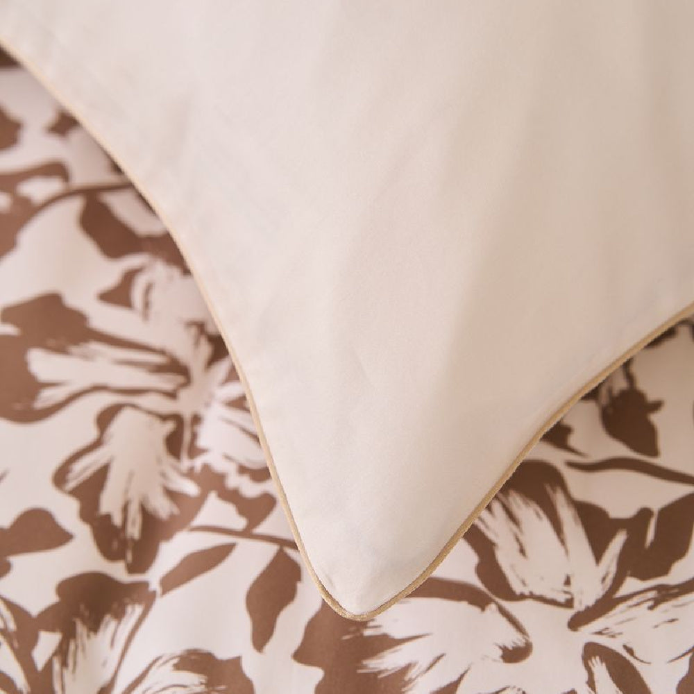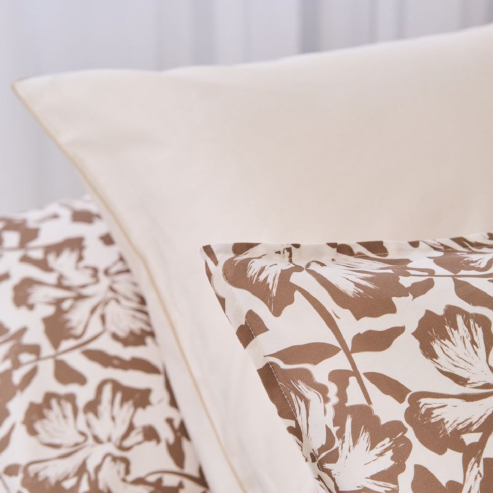 HOUSSE DE COUETTE SOLENE BUTTERMILK/BEACH de Nomo Un hommage au luxe subtil, où élégance et douceur s'harmonisent naturellement. Ce modèle se distingue par son allure sereine et ses détails raffinés, avec un élégant passepoil en satin qui enveloppe le linge de lit tel un cadre délicat. Ce passepoil scintillant court sur trois côtés de la housse de couette et entoure entièrement les taies d'oreiller, conférant à l'ensemble un aspect particulièrement soigné, presque architectural.
