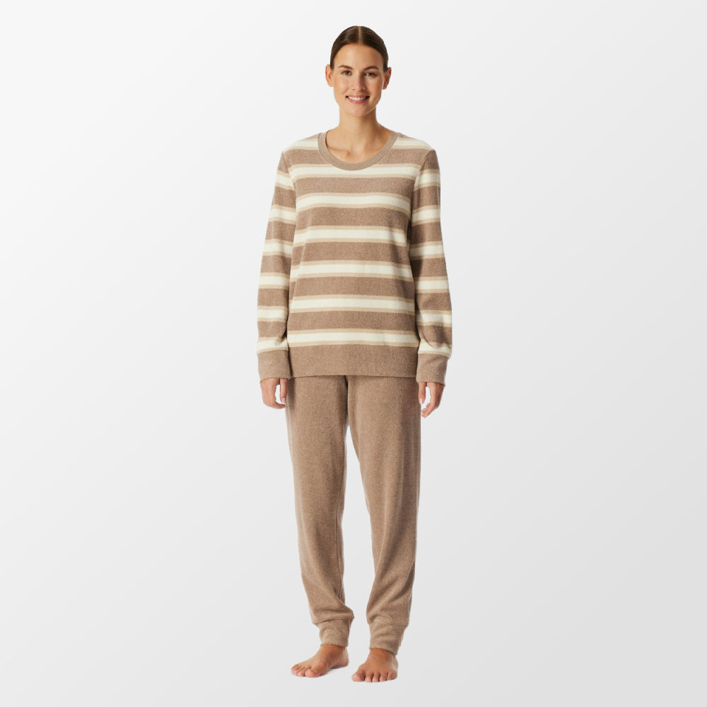 - Pyjama femme L'ange avec un haut rayé en taupe chiné et un pantalon taupe