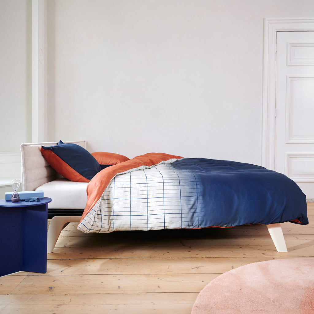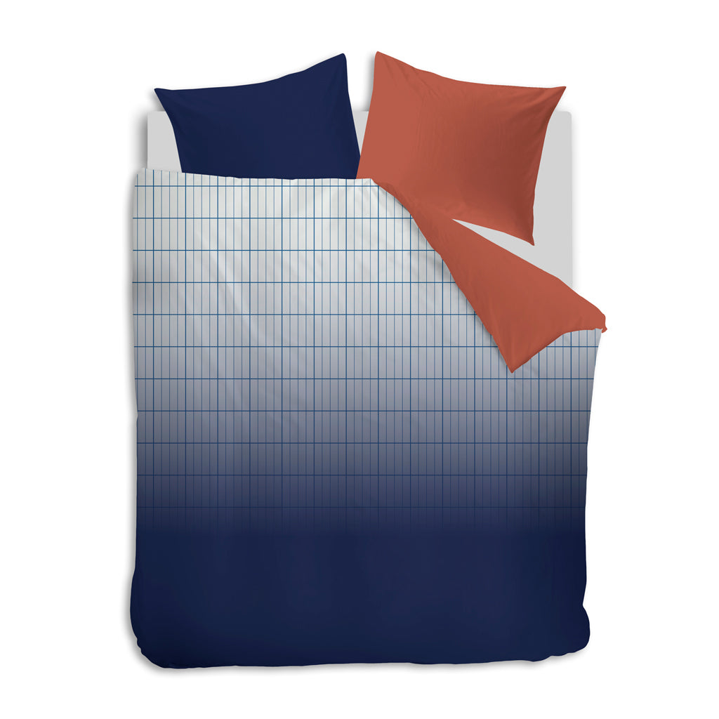 DEKBEDOVERTREK BLUE MOON van Auping heeft een dessin van het bekende ruitje uit een rekenschrift, in typisch Auping-blauw, op een ondergrond die zachtjes verloopt van licht witgrijs naar diep nachtblauw onderaan. De achterkant van deze katoensatijnen overtrek is in Dusty red, een fraaie combinatie met het nachtblauw op de voorkant.