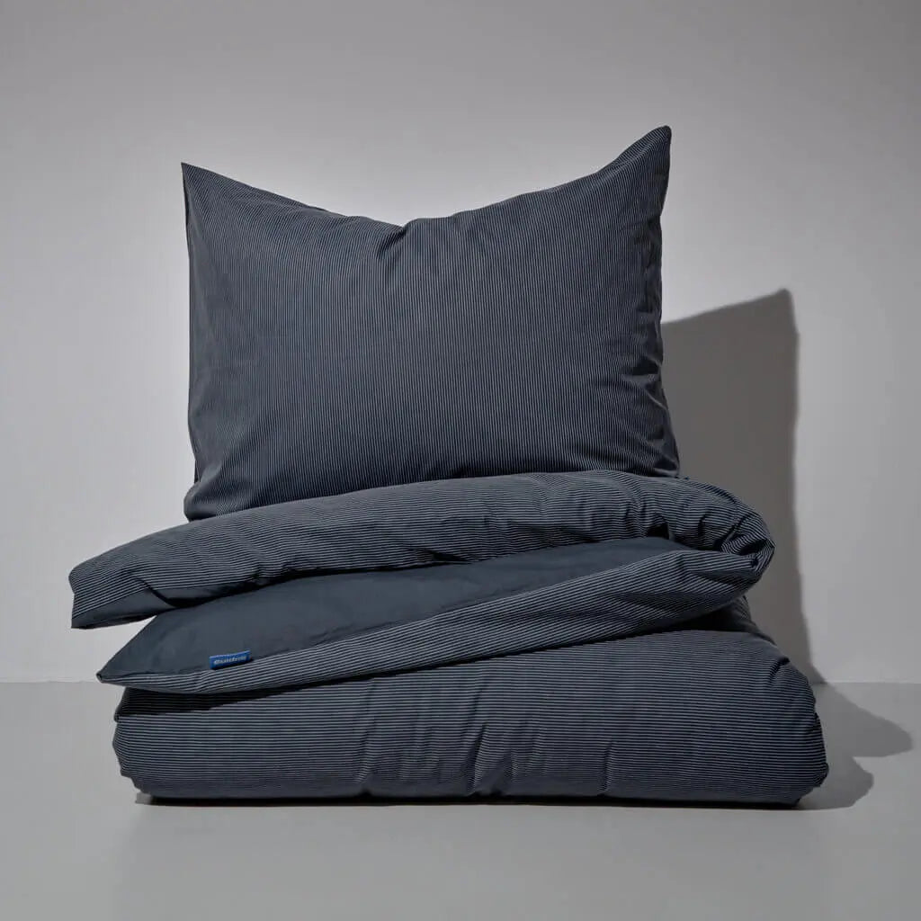 DEKBEDOVERTREK CASUAL LINES van Auping is een nachtblauwe, geweven overtrek met een verfijnde lijnstructuur van witte en diepblauwe garens. De achterzijde is effen nachtblauw. Omdat de perkaal garens eerst geverfd en dan pas geweven worden, oogt het dekbedovertrek heel luxueus.