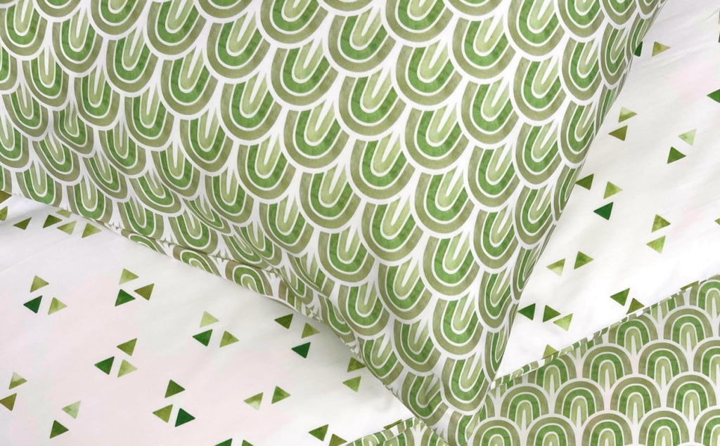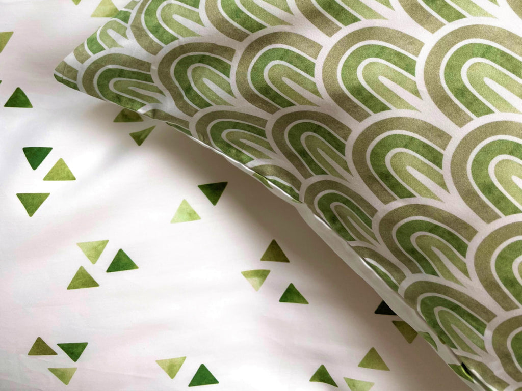 Milis heeft aan één kant een dessin van gebogen lijnen in diverse groentinten op een witte ondergrond. De andere kant heeft een print van groene driehoekjes op een witte ondergrond.