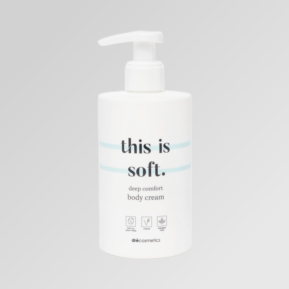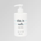 BODY CREAM "THIS IS SOFT" is een rijke body cream waarmee je jouw huid elke dag kan verwennen. Deze lichaamscrème bevat een gebalanceerde mix van actieve ingrediënten die je huid in alle mildheid voedt, diepgaand hydrateert en soepel en zijdezacht maakt. Met de geur van jasmijn en roze peper maakt het deze body cream onweerstaanbaar. Smeert heel gemakkelijk uit en wordt snel door de huid opgenomen. Je hebt geen plakkerig gevoel na het aanbrengen en je geniet de hele dag van het comfort van een heerlijk verzorgde huid. Bovendien bevat de crème geen minerale oliën en is parabenen- en siliconenvrij.