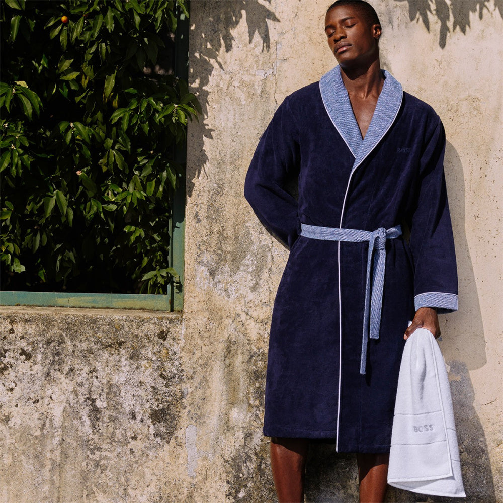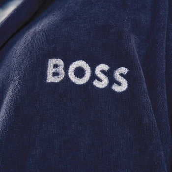 BADJAS LORD NAVY van Hugo Boss van heerlijk, zacht katoenen fluweel, 100% katoen 420 gr/m². De contrasterende sjaalkraag, wikkelriem en manchetten samen met 2 zakken aan de voorkant maken het stijlvol. Het logo Boss is links geborduurd op de borst. Voor een elegant contrast is de riem, mouwen en sjaalkraag afgewerkt met gestructureerd materiaal. Door de badstof aan de binnenkant neemt de badjas snel het vocht van uw huid op.