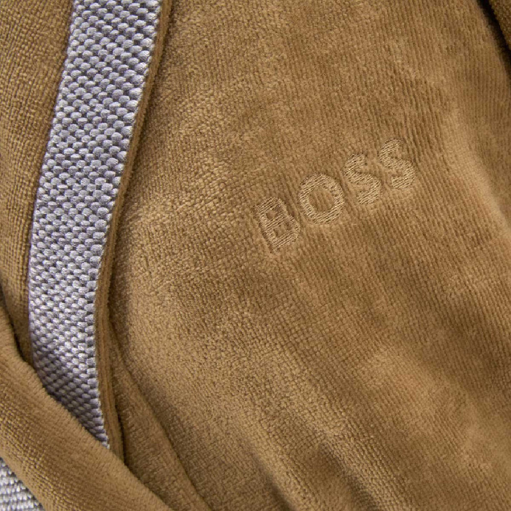 BADJAS LORD W CAMEL van Hugo Boss, is de perfecte keuze voor diegenen die op zoek zijn naar een elegante badjas Gemaakt van 100% katoen met een fluwelen textuur van 380 gram per vierkante meter, biedt deze badjas een heerlijk zacht gevoel op de huid. De stijlvolle contrasterende sjaalkraag, manchetten en tailleriem benadrukken de verfijnde uitstraling, terwijl het subtiele borduursel van het logo op de borst, uitgevoerd in ton-sur-ton draad, een extra vleugje luxe toevoegt.