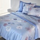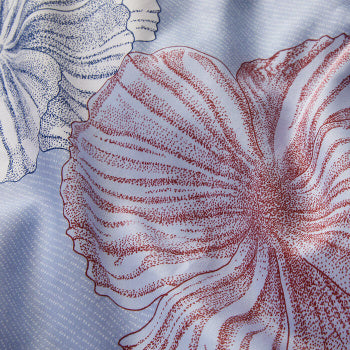 Het DEKBEDOVERTREK ASHLEIGH van Hugo Boss met gekleurde en ingeweven bloemen. Het bloempatroon getint met donkerblauw en granaat is delicaat en licht gevormd door een myriade van stippen. De blauwe achterkant wordt geanimeerd door een fijne gedrukte lijn.