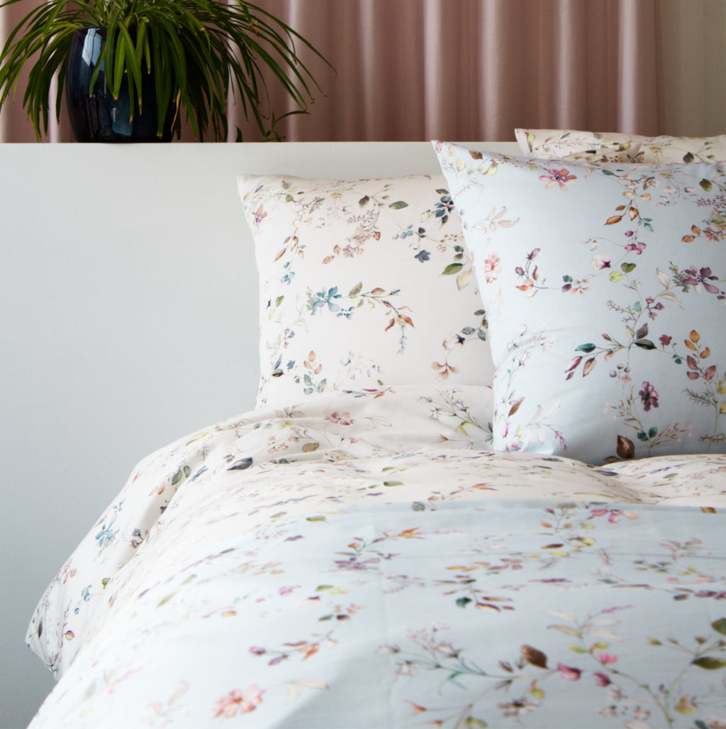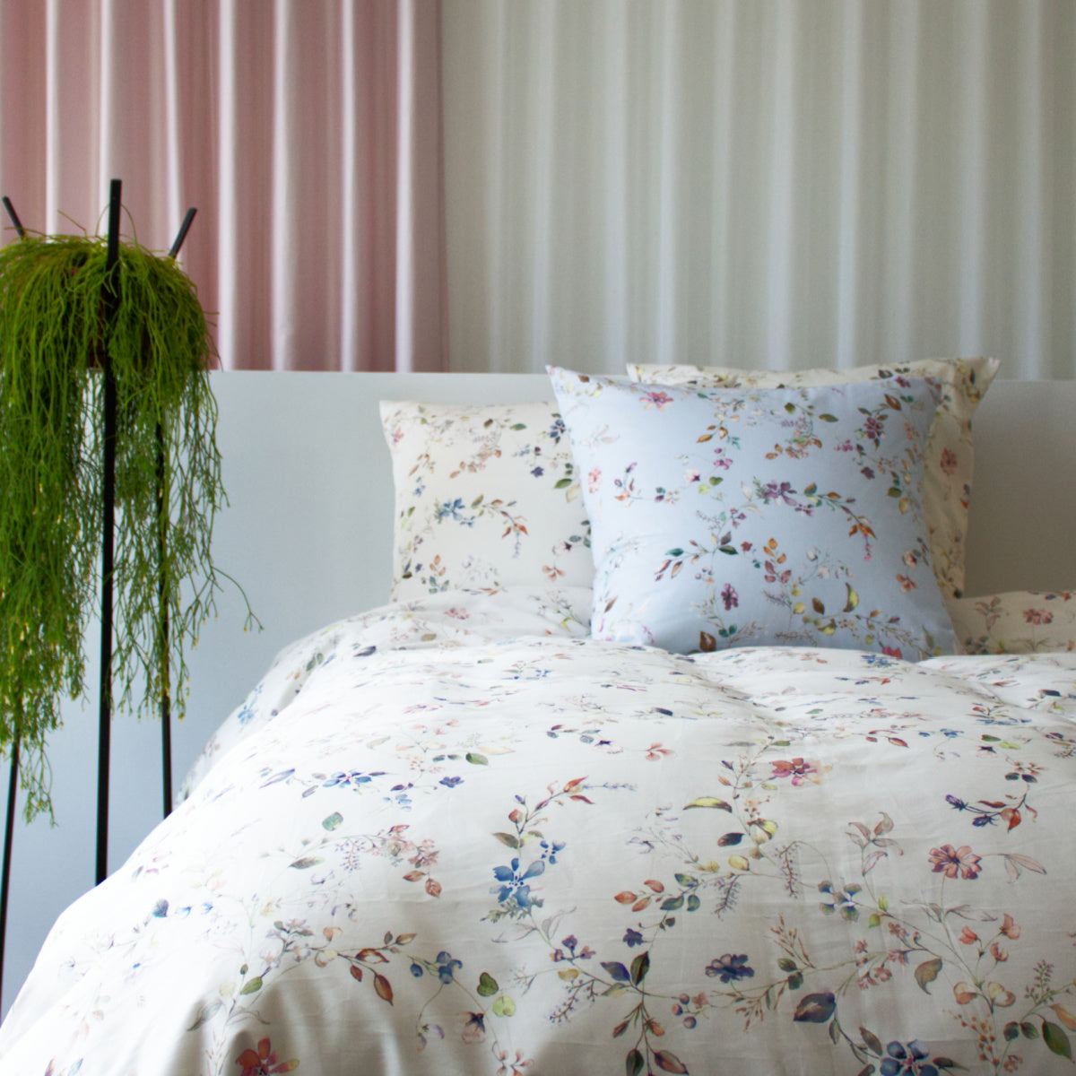 DEKBEDOVERTREK AUXERRE van Lysdrap heeft een klassieke bloemenprint in zachte kleuren op een champagne ondergrond. De achterkant van het dekbedovertrek is effen champagne.
