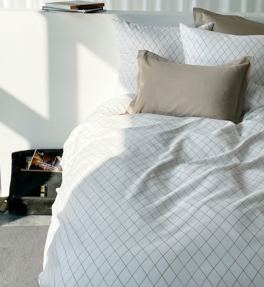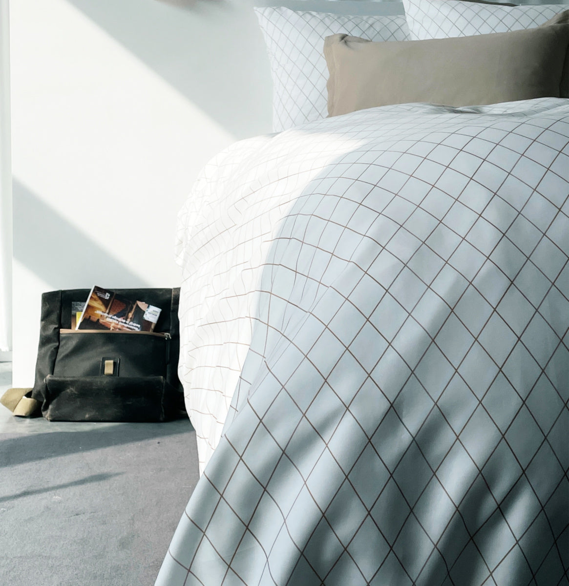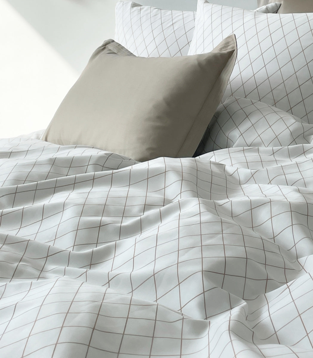 DEKBEDOVERTREK ROMBA van Lysdrap heeft een fijn ruitjespatroon in lichtbruin op een witte ondergrond. De achterkant van het dekbedovertrek is effen wit.