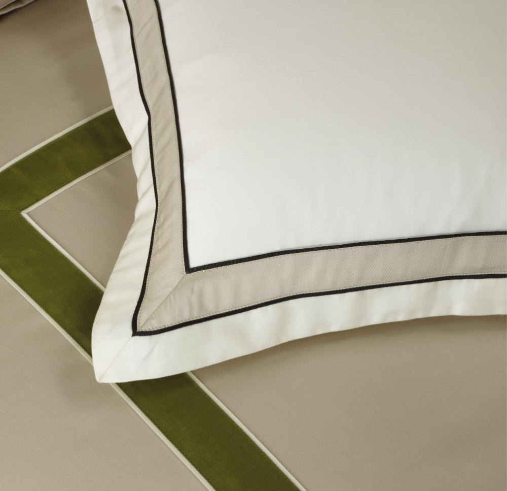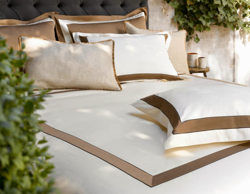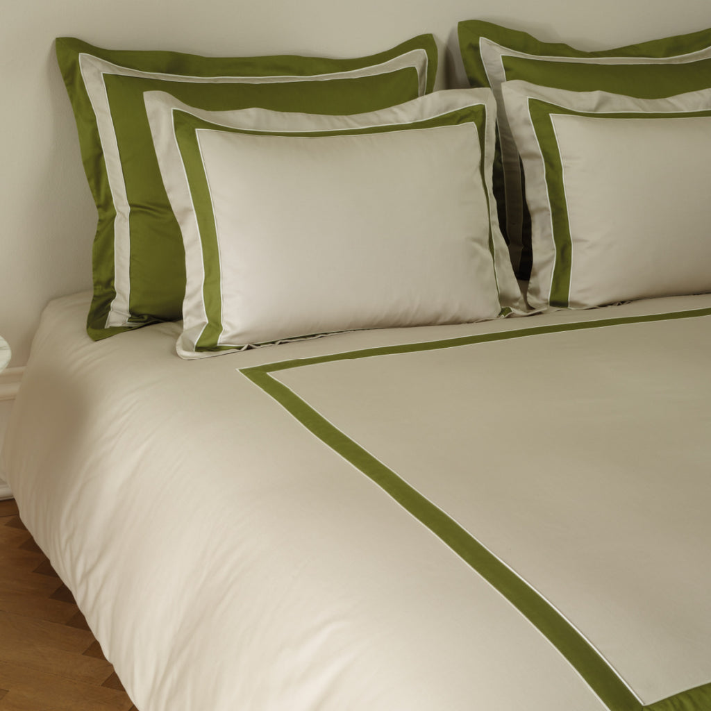 DEKBEDOVERTREK ABADI van Mirabel Slabbinck in 100% Egyptisch gekamd katoensatijn is een prachtig ontwerp met een fijn lintje gestikt rond de gekleurde band. Het model is verkrijgbaar in tal van kleuren. De kwaliteit en de kleur van de stof en het lint kan u zelf kiezen. Dit dekbedovertrek is een tijdloos model. Speciale afmetingen zijn mogelijk.