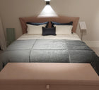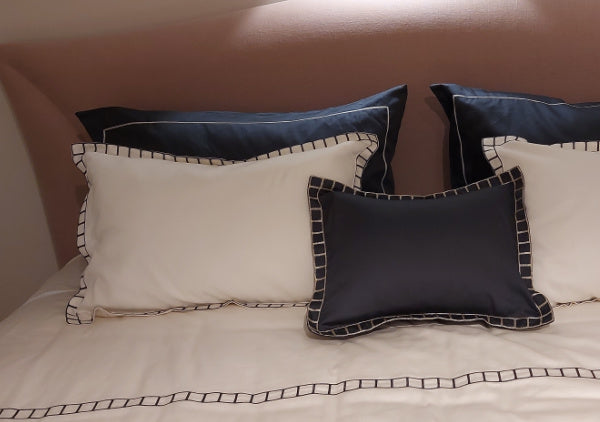 DEKBEDOVERTREK TAKRA van Mirabel Slabbinck in 100% Egyptisch gekamd katoensatijn is een prachtig ontwerp met een borduursel van blokjes rondom de slopen en op het overtrek.