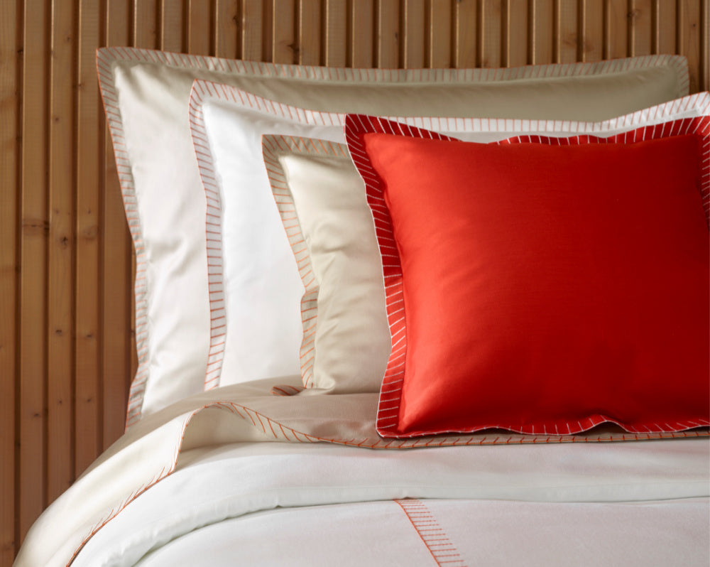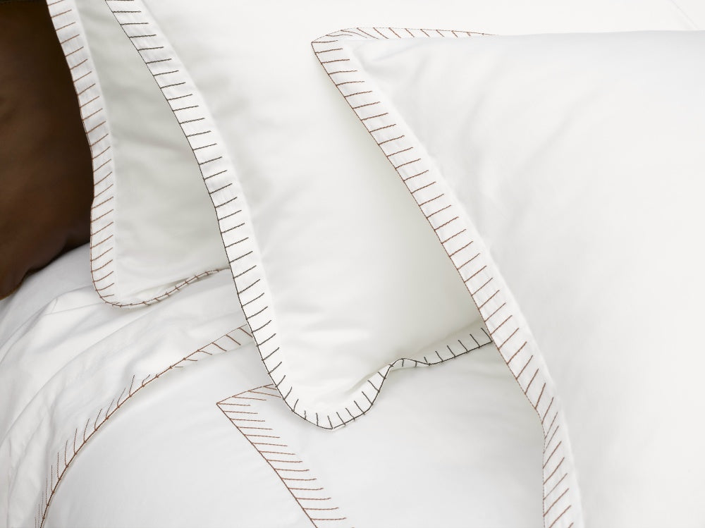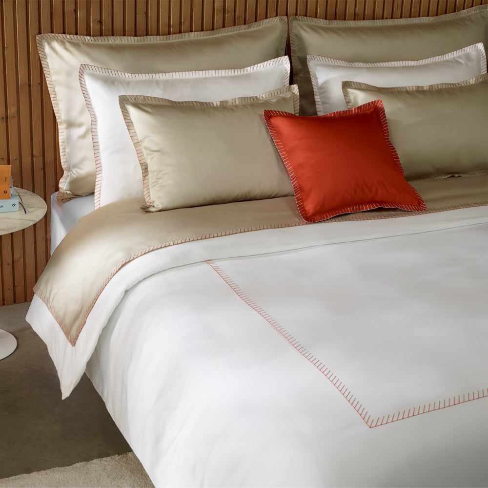 DEKBEDOVERTREK RYBINA in 100% Egyptisch gekamd katoen satijn is een prachtig, strak ontwerp. De gestileerde visgraat zorgt voor een perfecte symmetrie op voor- en achterzijde van de volant. Hierdoor wordt een tijdloos en elegant borduurwerk gecreëerd.