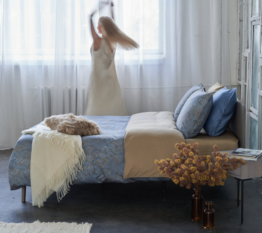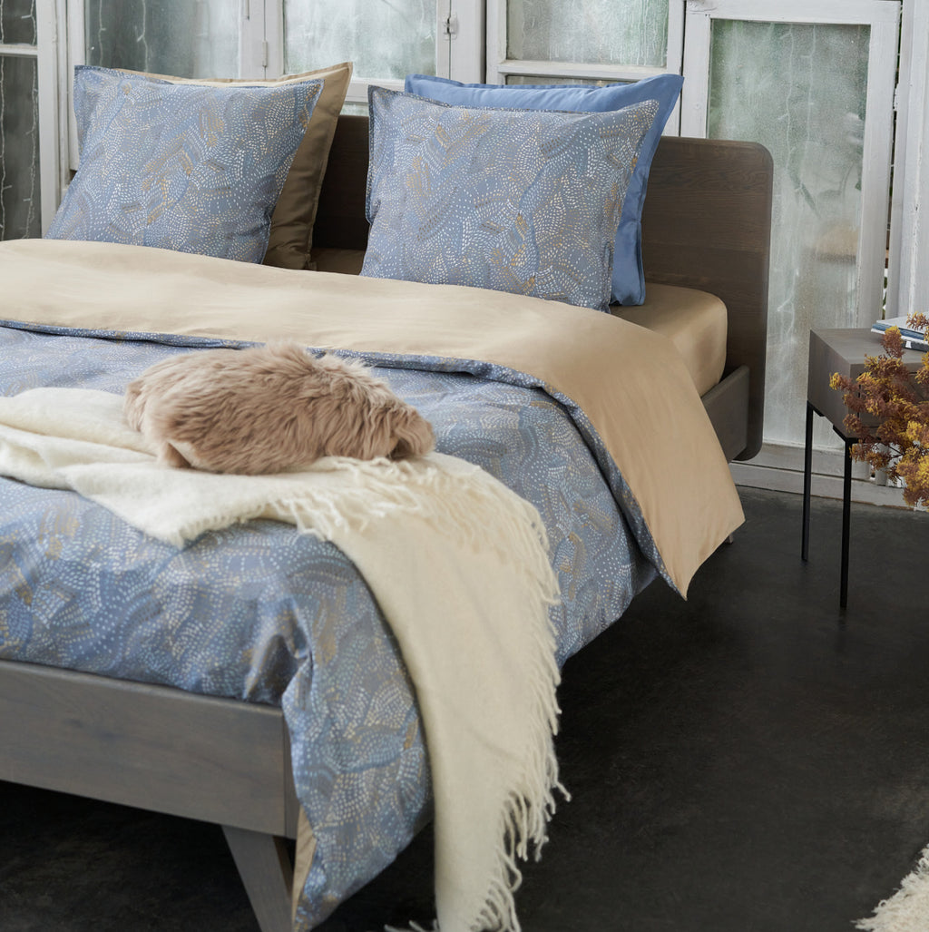 DEKBEDOVERTREK EVIE MOONLIGHT BLUE glanst en fonkelt sfeervol in uw interieur dankzij de prachtige kleuren. Een lust voor het oog. De onderzijde is effen zandkleurig.