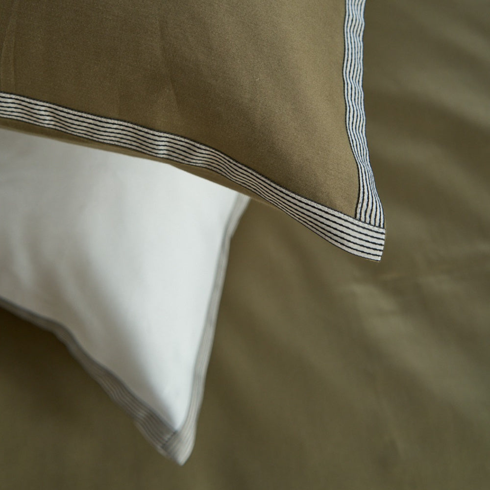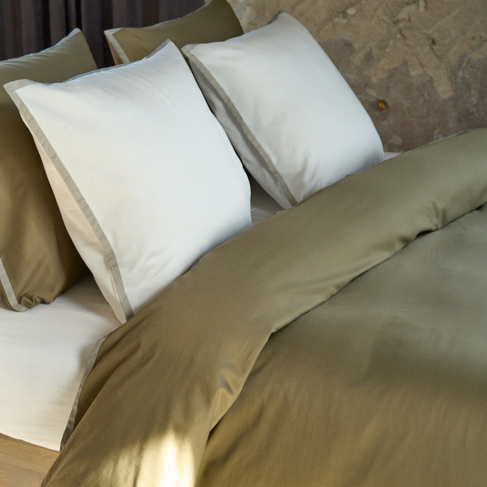 Dit beddengoed van voortreffelijk Egyptisch satijnkatoen is afgewerkt met een verfijnde bies in ivoor en antraciet en biedt een luxueuze uitstraling. Combineer het met uni satijn in Light Kaki of Offwhite voor een extra vleugje stijl.