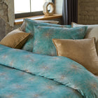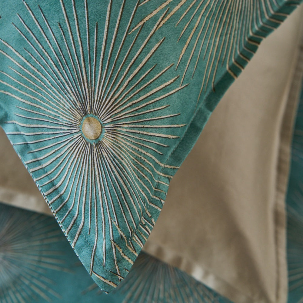 DEKBEDOVERTREK LYRA DARK JADE van Nomo is een ware lust voor het oog. Dit ontwerp, met een delicaat patroon van gouden sterren op een rijke jadeachtergrond, roept de schoonheid van een sterrennacht uit. In slaap vallen onder de sterren, met de luxe van katoen satijn en de allure van de nachtelijke hemel. De achterkant van de overtrek is effen en de slopen zijn afgewerkt met biais.