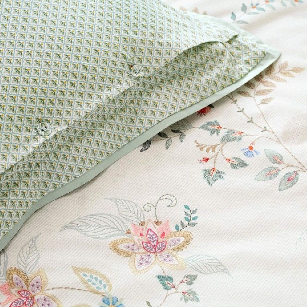 De print van het DEKBEDOVERTREK KILI FLOWER WHITE van Pip Studio omvat kleine bloemen die elegant over het dekbed zijn verspreid, wat de indruk wekt dat de bloemen met zorg zijn geborduurd. De zijbanen zijn versierd met een herhaald bloemenpatroon en een subtiel decoratief randje, wat de luxe uitstraling verder versterkt. Aan de achterkant van de overtrek is een stijlvolle tegelprint te zien, wat een bijzonder verrassend effect creëert wanneer je het omdraait.