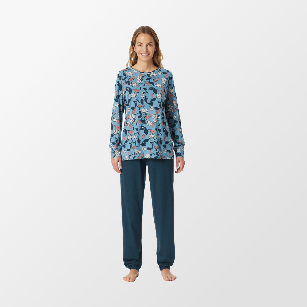 - lange damespyjama met bedrukt shirt met bloemen in blauw, rood en wit en nachtblauwe broek