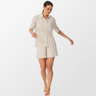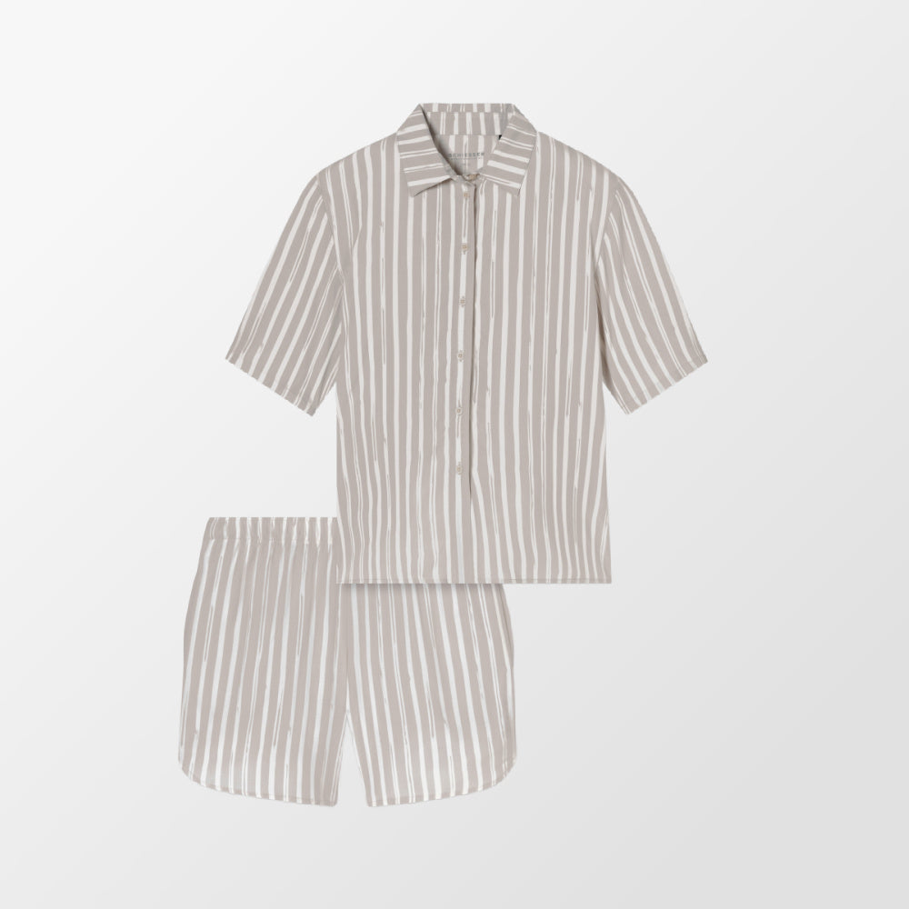 De PYJAMA KORT STREPEN van Schiesser in grijs jaspé is vervaardigd met een losse, boxy snit die een ontspannen gevoel biedt. Ontdek de ideale mix van elegantie en gemak met onze korte damespyjama uit de SCHIESSER-collectie "selected! premium".