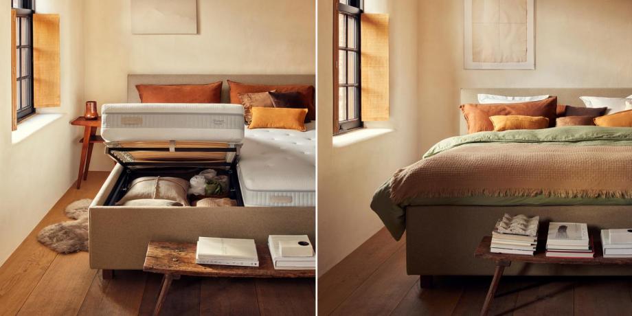 Het gestoffeerde bedkader is 40 cm hoog. Het bed kan in 3 posities geopend worden. De compartimenten kunnen ofwel samen ofwel apart geopend worden. Voor de laatste optie moet je 2 aparte matrassen kiezen. Je kan probleemloos tot 15 kg onder elk ligvlak opbergen.