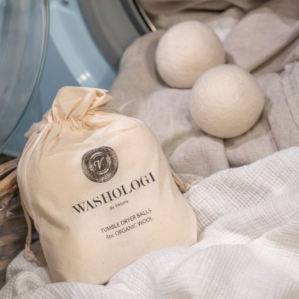 TUMBLE DRYER BALLS van Washologi zijn biologisch en gemaakt van 100% wol. Deze wolbolletjes zijn een alternatief voor wasverzachters omdat ze kleding zachter maken en statische elektriciteit verminderen. De droogtijd wordt verkort tot 30%. De drogerballen hebben een levensduur van 4-5 jaar, waardoor ze een duurzame en kosteneffectieve keuze voor de lange termijn zijn. Zitten per 4 stuks in een set.
