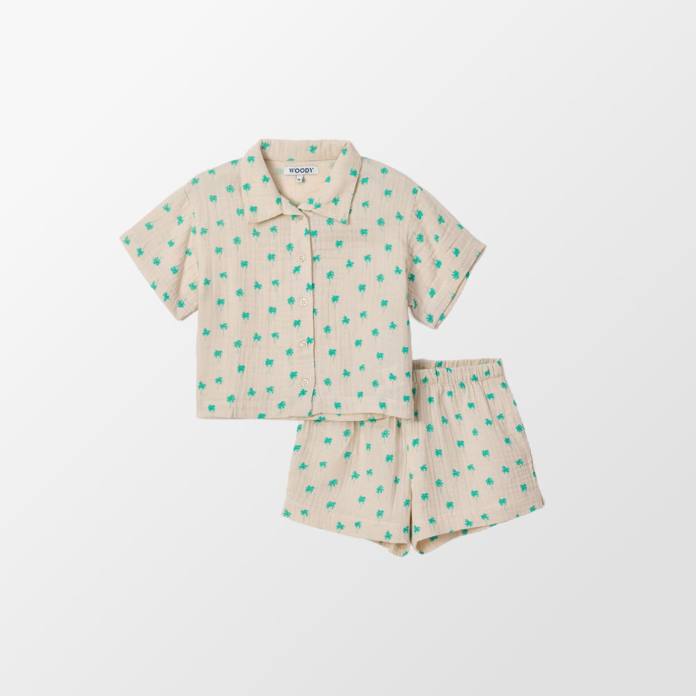 WOODY PYJAMA PALMBOMEN in zachte tetra katoen is de perfecte keuze voor de warme zomernachten. Het setje bestaat uit een crèmekleurig topje met korte mouwen en een shortje, beide voorzien van een vrolijke palmbomenprint. De ademende tetra katoen zorgt voor een heerlijk comfortabele pasvorm, waardoor je kleintje de hele nacht fris blijft. De speelse print voegt een zomerse flair toe aan de pyjama, ideaal voor de vakantie of een rustige nacht thuis.
